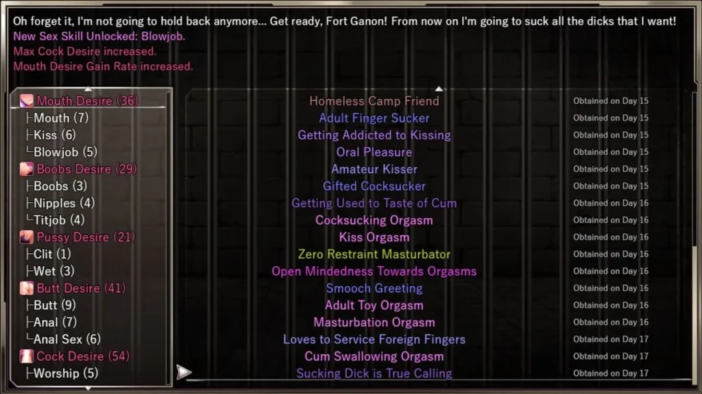 | Use “alternative” methods to pacify inmates after a battle. | Gain significant money and reduce Desire/Stress meters instantly. | Unlocks new passive skills for Karryn, making her more effective in this role but shifting her dialogue and self-perception. |