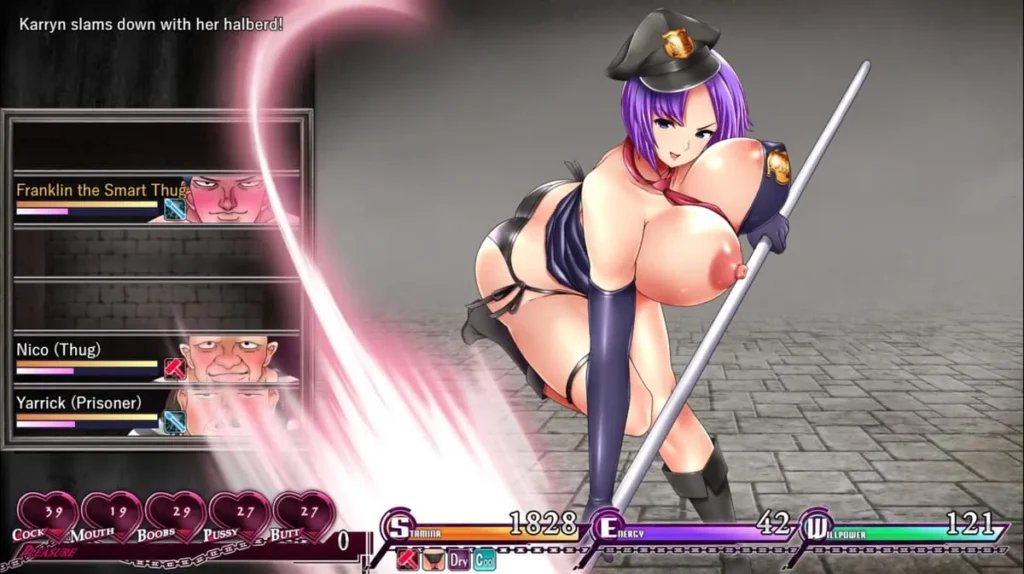- The JRPG Battles: Here’s the twist. Inmates have “Stress” and “Desire” meters. If they get too high, they might challenge Karryn directly in a turn-based JRPG-style battle. 🎮 You use a deck of “Prisoner Management” skills to subdue them. These battles are strategic and fun, not just simple click-fests.