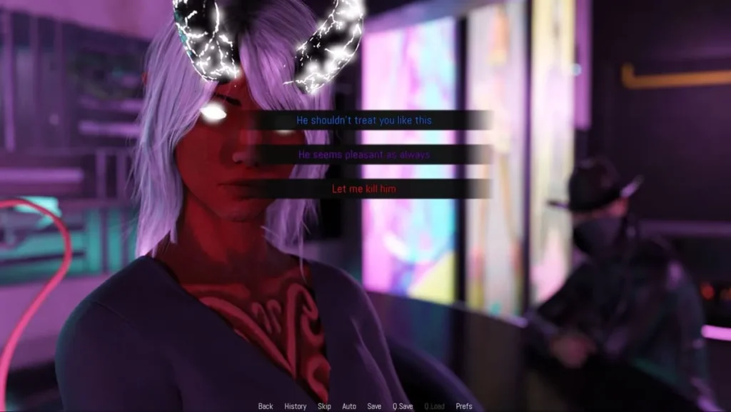 To understand how you interact with this world, you need to know about the dialogue system. Projekt Passion uses a brilliant color-coded choice mechanic that lets you shape your protagonist’s personality in real-time: